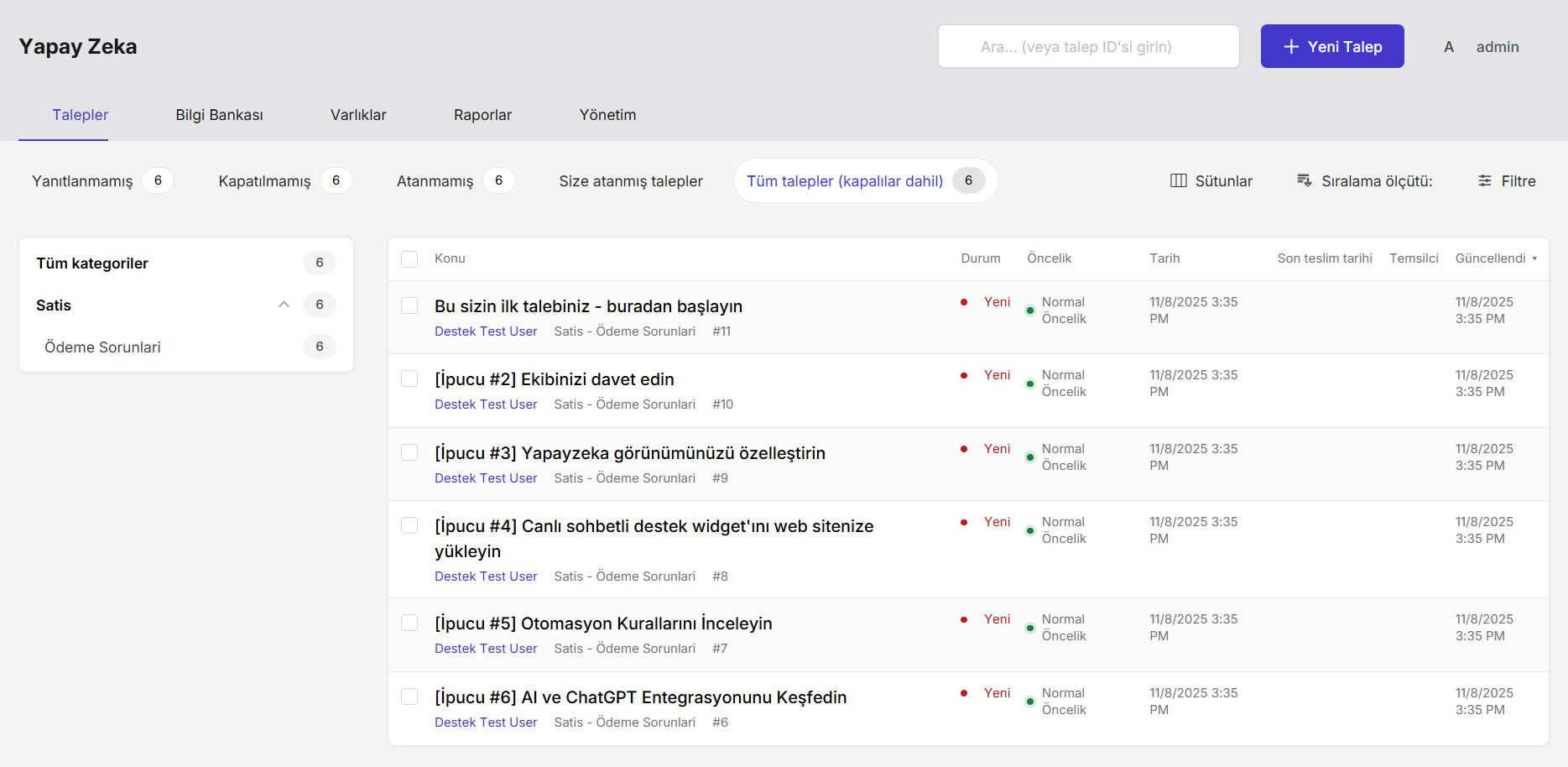 - Süper Yapay Zeka ’nın ana ekranı, mevcut taleplerli ve ilgili bilgileri gösteren güçlü bir liste özelliğine sahiptir. İsteklerinizi kolayca sıralayabilir, filtreleyebilir ve hızlıca toplu işlemler yapabilirsiniz. Talepler gerçek zamanlı olarak güncellenir, böylece hiçbir talep gözden kaçmaz ve sayfayı yenilemeye gerek kalmaz. İster uzman destek temsilcisi, ister yönetici olun, arayüz ihtiyaçlarınıza göre esnek bir şekilde uyum sağlar.